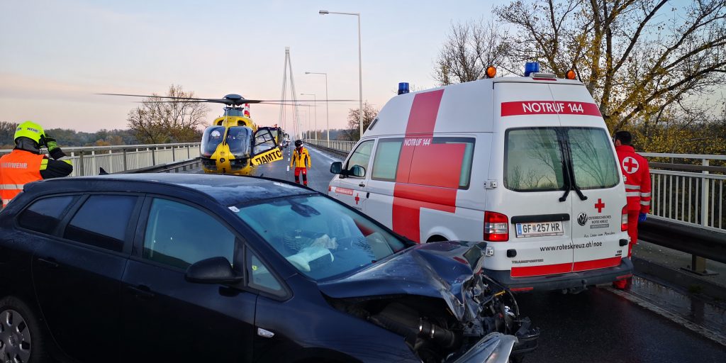 Sofort rückten wir mit RLFA1 und VRFA zum Einsatzort auf die Donaubrücke aus. Vor Ort fanden wir folgende Lage: Aus unbekannter Ursache kollidierten 2 Fahrzeuge und ein Lenker wurde in seinem Fahrzeug eingeklemmt. Mittels hydraulischen Spreizer und Rettungszylinder wurde ein Zugang geschaffen. Nachdem die verletzte Person durch das Rote Kreuz erstversorgt war, konnte die Person aus dem Fahrzeug gerettet und der Besatzung des Rettungshubschraubers übergeben werden. Im zweiten Fahrzeug galt es zwei weitere Personen gemeinsam mit dem Roten Kreuz zu Versorgen. Hierbei unterstützte uns die FF Wolfsthal, da diese bei solch einer Alarmstufe automatisch mitalarmiert wird. Zwischenzeitlich wurde unser Wechselladefahrzeug für die Fahrzeugbergung nachgezogen. Um die Straße schnellstmöglich von den Wracks frei zu machen, unterstützte uns die FF Engelhartstetten mit ihrem Wechselladefahrzeug.