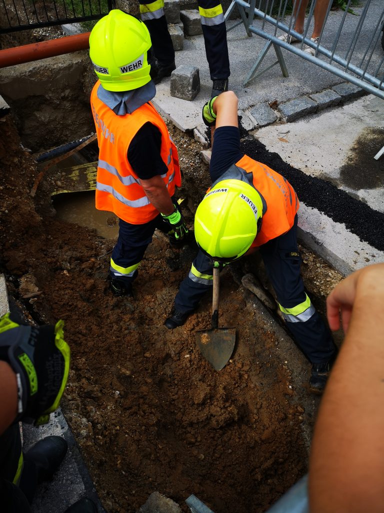 Eine Baugrube war eingestürzt und Leitungen der Fernwärme drohten zu brechen, lautete die Alarmierung. Sofort rückten wir mit RLFA1 und VRFA zum Einsatzort aus.Vor Ort wurde festgestellt, dass eine Asphaltplatte in die Baugrube gerutscht war und auf den Leitungen der Fernwärme lag. Wir entfernten diese händisch.